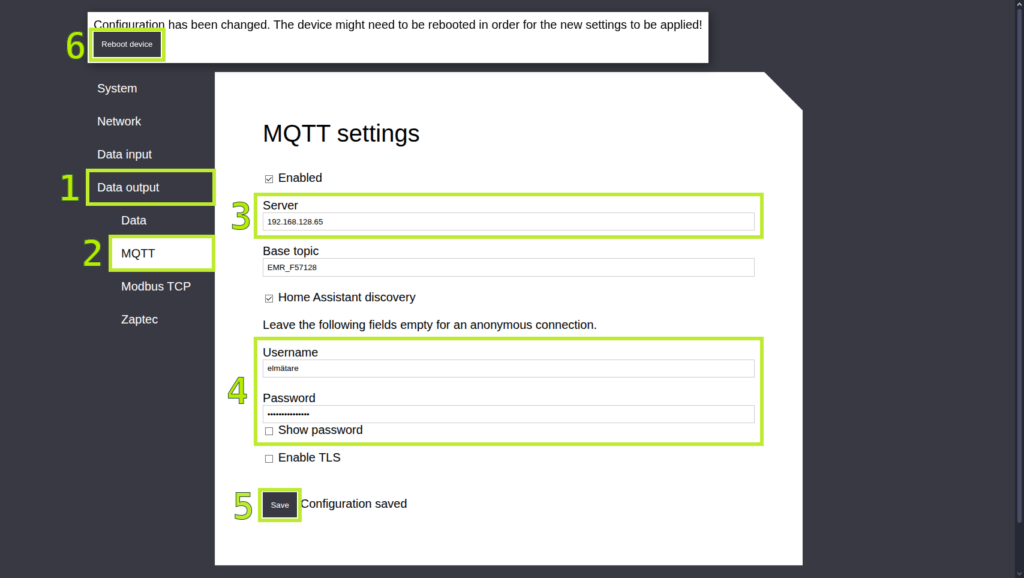 Öppna elmätaravläsarens webbgränssnitt i din webbläsare och navigera till ”Data ouput → MQTT”. Här ställer du in ip addressen till Home Assistant Green under ”Server” och anger användarnamn och lösenord till användaren du skapade i steg 3 eller någon annan användare som finns i Home Assistant.