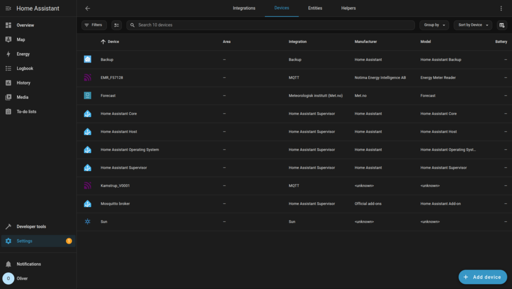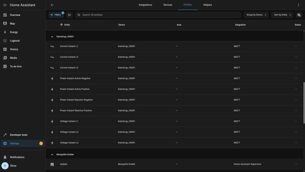 När elmätaravläsaren har startat om bör den ansluta till Mqtt-brokern och automatiskt lägga upp både elmätaravläsaren och elmätaren den är ansluten till som enheter i Home Assistant. Alla mätvärden som elmätaravläsaren tar emot kommer också att läggas upp som entiteter. Notera att det kan ta upp till 10 sekunder från att anslutningen har upprättats tills att enheterna och entiteterna dyker upp i Home Assistant.