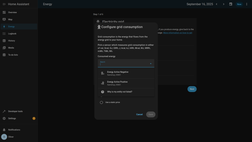 Nu när vi har fått in dessa entiteter kan vi konfigurera Home Assistant att hålla reda på energiförbrukningen. Det gör man genom att navigera till ”Energi” och klicka på ”Lägg till förbrukning”. Välj sedan entiteten som heter ”Energy Active Positive”.
