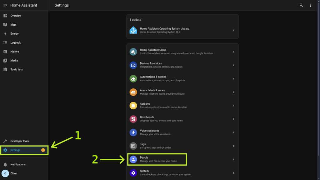 När du har skapat ett användarkonto och loggat in i Home Assistant klickar du på ”Inställningar → Enheter och tjänster”.