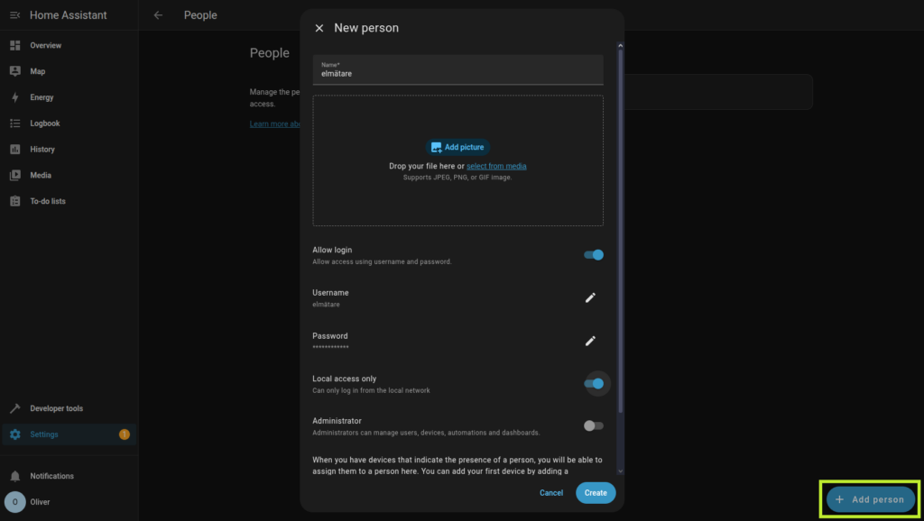 Sedan klickar du på knappen ”Lägg till person” och väljer ett användarnamn och lösenord. Det kan även vara bra att välja ”Endast lokal åtkomst” så länge elmätaravläsaren inte behöver kunna ansluta från ett annat ntäverk.